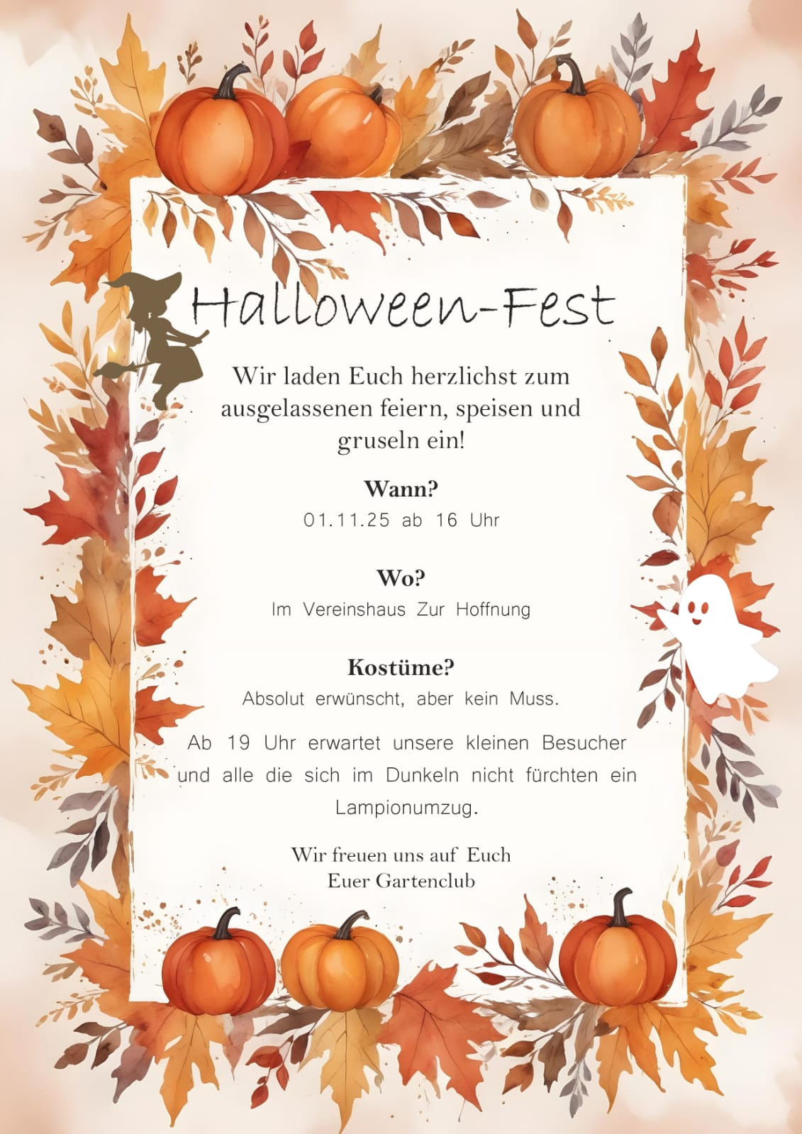 Am 01.11.25 findet ab 16:00 im Vereinshaus ein Halloween-Fest statt. Kostüme sind absolut erwünscht, aber kein Muss. Ab 19:00 gibt es einen Lampionumzug.
